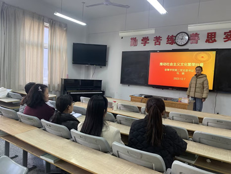 12月7日中午,太阳成集团tyc539第二党支部书记马娟在碧螺校区D101开展以《推进社会主义文化繁荣兴盛》为主题的党课。本次党课围绕“文化自信是更基本、更深沉、更持久的力量;坚持用社会主义核心价值观凝心聚力;进行无愧于时代的文艺创造”三个方面展开阐述。