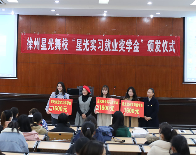 颁奖仪式上,陈书记对薛黔星董事长一行的到来表示热烈的欢迎。接着,陈书记介绍了“星光实习就业奖学金”设立的基本情况。为促进校企发展,提升人才培养质量,今年7月,徐州星光舞校和公司签订了校企合作协议,并在公司设立“星光实习就业奖学金”,用于奖励在星光舞校顶岗实习,并顺利通过考核,成为其正式员工的公司舞蹈表演专业优秀毕业生。星光舞校薛董事长宣读了获奖员工名单,为三位同学颁发了奖学金。三位同学分别发言,她们向与会的师生们汇报了自己实习期间取得的成绩和成长感悟,感谢星光舞校给予的关心和激励,并表示将一如既往,继续努力,用自己的实际行动为社会做出自己应有的贡献,不辜负公司和企业的支持和期望。