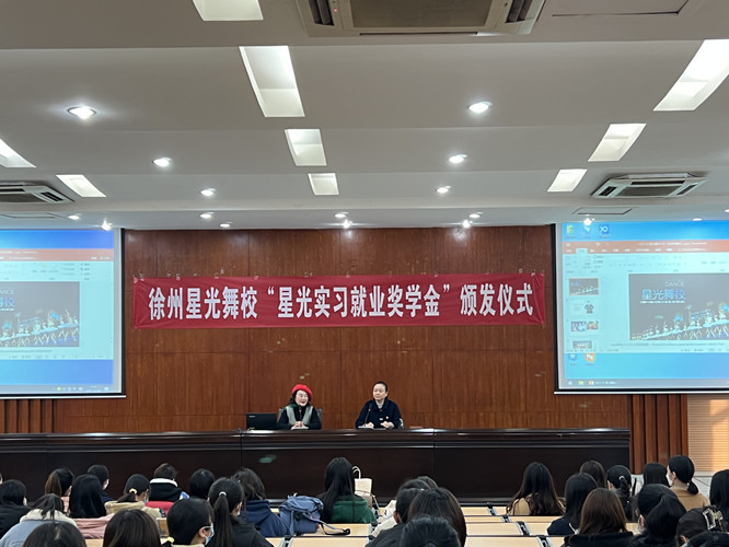随后,薛董事长讲话,薛董事长充分肯定了公司人才培养质量,对三位同学实习期间的表现赞赏有加,薛董事长希望更多地徐州学子加入星光舞校,成为其中的一员,颁奖仪式结束后,徐州星光舞校面向全体员工开展了校园宣讲会。