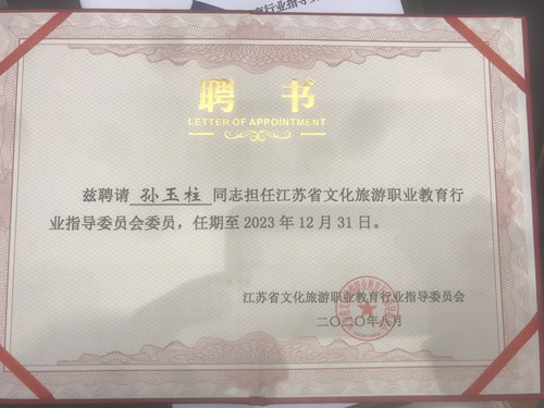 我系孙玉柱教授受聘为江苏省文化旅游职业教育行业指导委员会委员