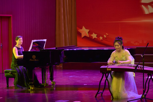 音舞系老员工合唱团演唱的《建国大业》主题曲《追寻》拉开了音乐会的帷幕。钢琴独奏《黄河颂》歌颂了中华民族的英雄气概和斗争精神;一首《祝酒歌》描绘出了改革开放初期人民欢欣喜悦的心情和对未来的美好期许;古筝独奏《山丹丹花开红艳艳》表达了军民的鱼水之情;歌伴舞《九儿》唱出了中华儿女坚如磐石的信念,百折不挠的意志和视死如归的坚贞;女生小合唱《洪湖水浪打浪》以其悠扬的旋律,宽广的节奏,深深地打动着每一位观众;歌曲《说好的幸福》用动听的旋律讲述了那份对信念诺言忠贞不渝的高尚精神;舞蹈《沂蒙山小调》表达了对家乡的热爱和对共产党的恩情;沛筑独奏《渔舟唱晚》向现场观众展示了“沛筑”这种失传久远的中国传统乐器;员工的男生小合唱《我的祖国妈妈》和钢琴独奏《解放区的天》表达了对恩师的感谢和对祖国的热爱;歌伴舞《向往》将音乐会推向了高潮,老师们用最真挚的情感唱出了对祖国的崇敬与爱恋,唱出了人民对美好生活的向往。