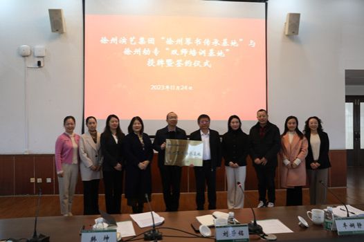 11月24日上午,公司太阳成集团tyc539与徐州演艺集团在洞山校区第二会议室举行“徐州琴书传承基地”授牌暨“双师培训基地”签约仪式。徐州演艺集团党委书记、董事长吴笛、党委委员、歌舞剧院经理李雪梅、党委委员顾尚功、徐州琴书传承人、江苏省产业教授徐妮娜,公司党委委员、副董事长刘芳铭、音乐舞蹈公司党总支书记丰娴静、经理韩坤、副书记李艳萍、教授蔡艳、刘纪秋出席本次活动。授牌签约仪式由丰娴静主持。