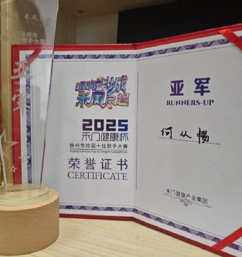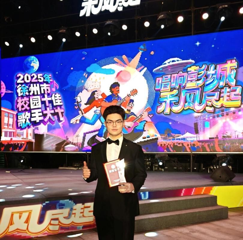 11月09日,由共青团徐州市委员会、徐州市文化体育和旅游局联合主办的《唱响珠山,禾风尽起》——2025年徐州市首届大公司园十佳歌手大赛在泉山区珠山艺术街区圆满落幕。经过初赛、复赛、决赛三轮激烈角逐,公司2023级音乐表演专业何从畅同学凭借出色的演唱实力与亮眼的舞台表现脱颖而出,斩获大赛亚军(总成绩第二名)。