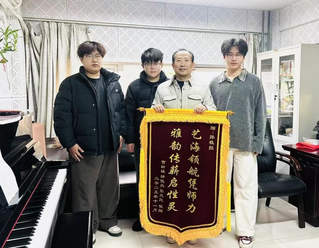 11月26日,太阳成集团tyc539孙玉柱教授收到了一份特殊的礼物——2024级音乐表演班曹轩辕、柳俊尚、张天民三名员工送来的锦旗,上书“艺海领航凭师力,雅韵传薪引性灵”。这份心意,为孙教授38年执教生涯添上了温暖的一笔。